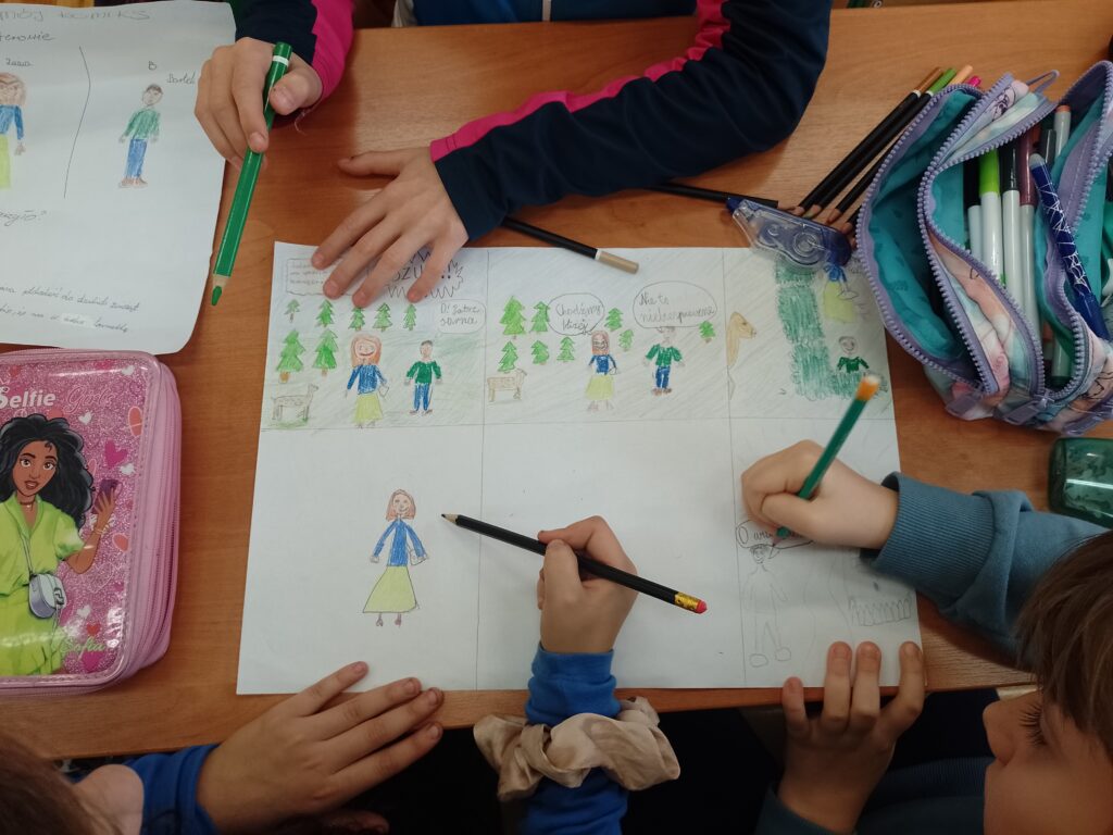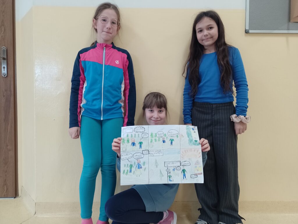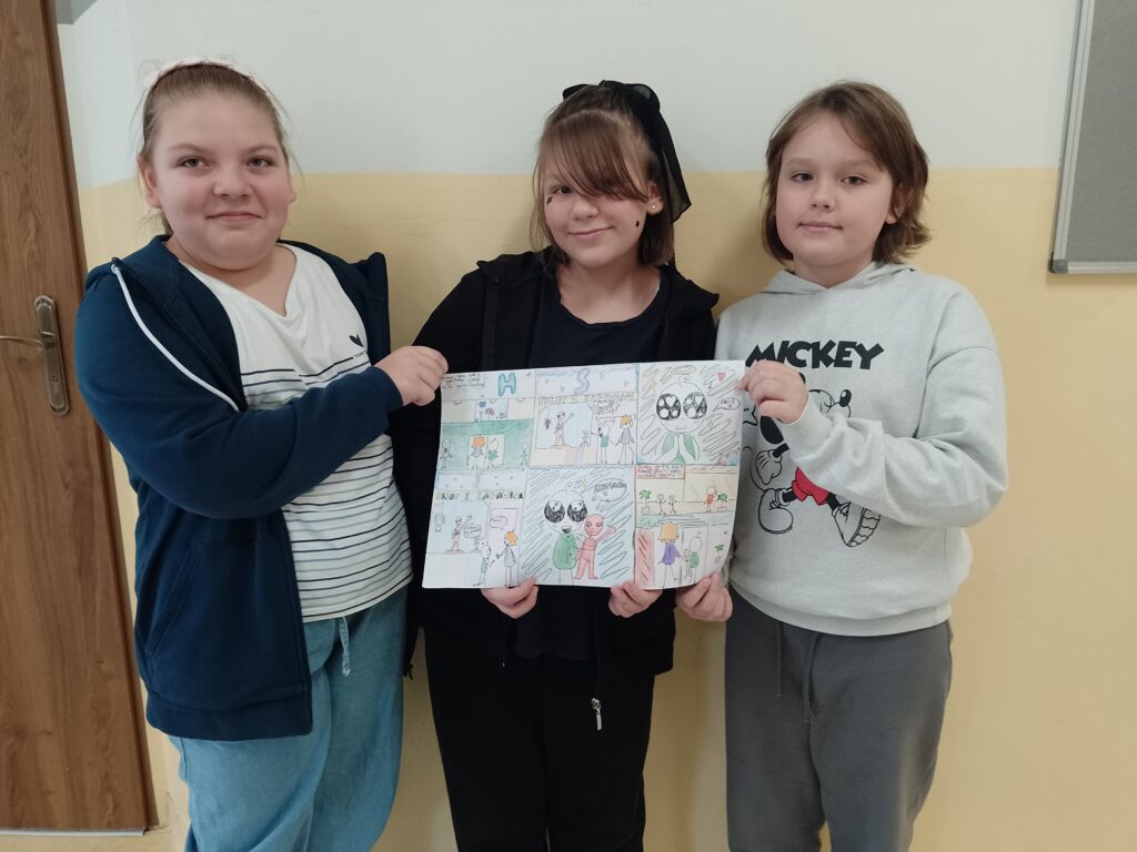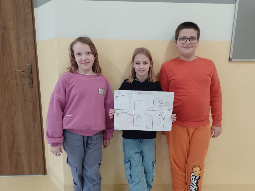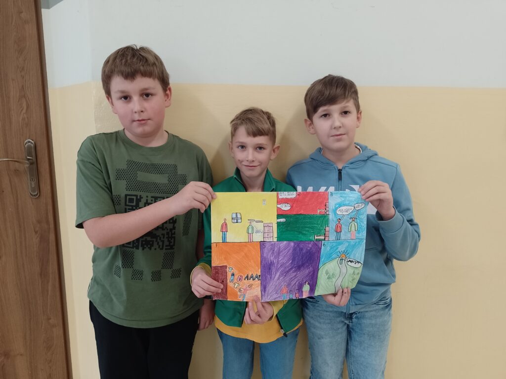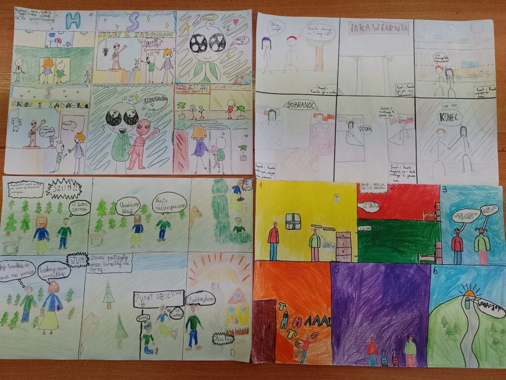 BUDUJEMY RELACJE – TWORZYMY KOMIKSY, czyli projekt klasy IVa. Po omówieniu lektury ,,Kajko i Kokosz. Szkoła latania” uczniowie klasy IVa zmierzyli się z zadaniem projektowym polegającym na stworzeniu w grupach własnych komiksów.