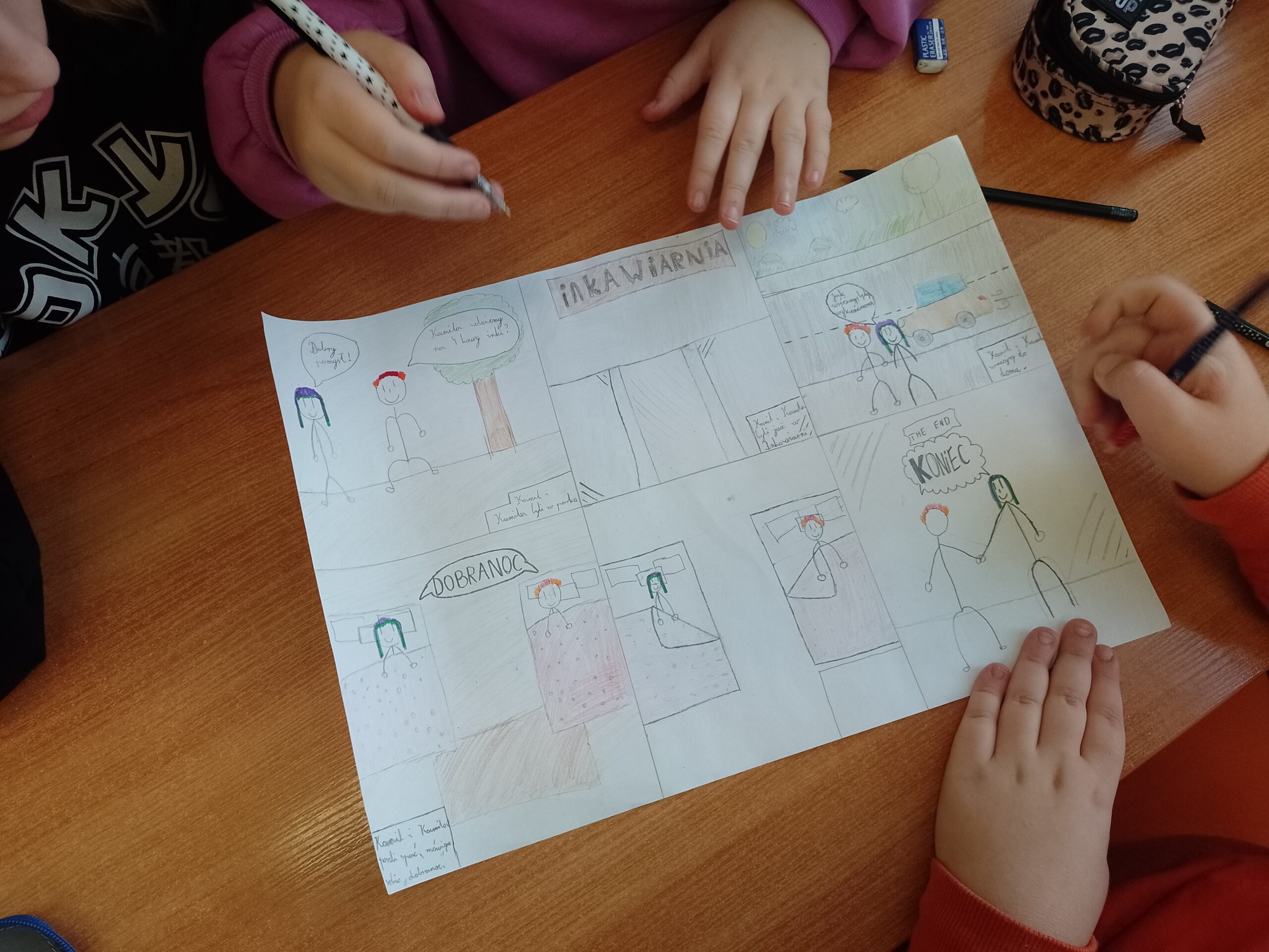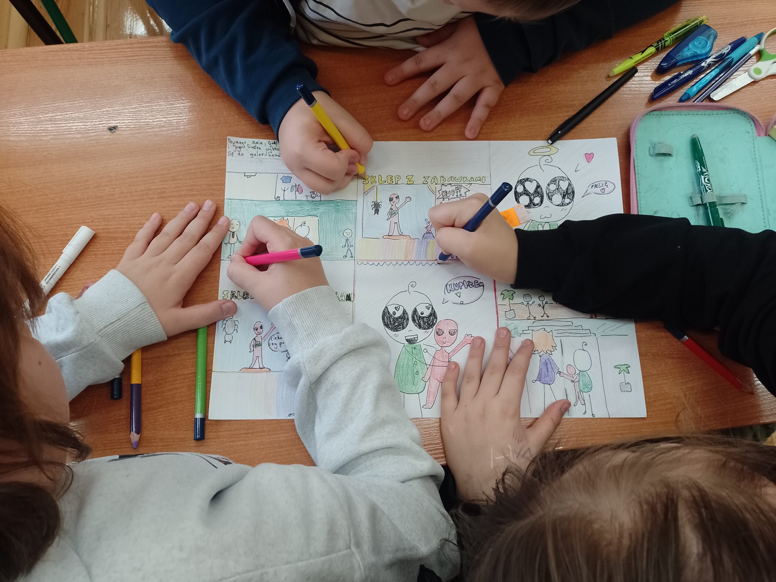 BUDUJEMY RELACJE – TWORZYMY KOMIKSY, czyli projekt klasy IVa. Po omówieniu lektury ,,Kajko i Kokosz. Szkoła latania” uczniowie klasy IVa zmierzyli się z zadaniem projektowym polegającym na stworzeniu w grupach własnych komiksów.